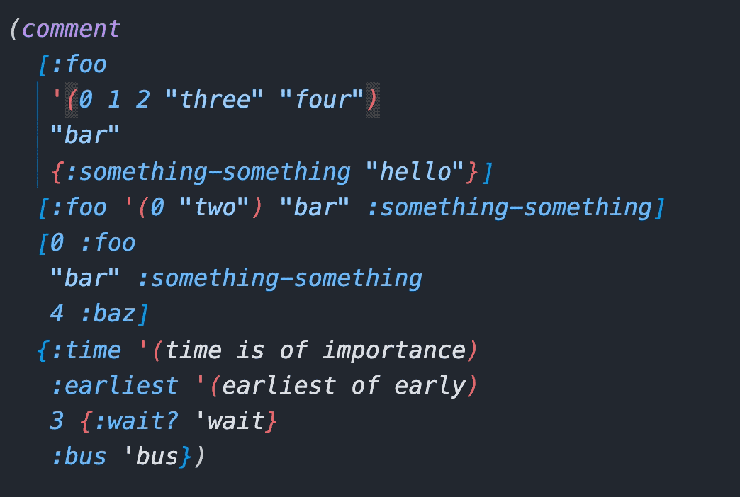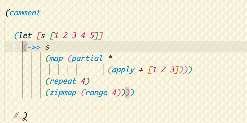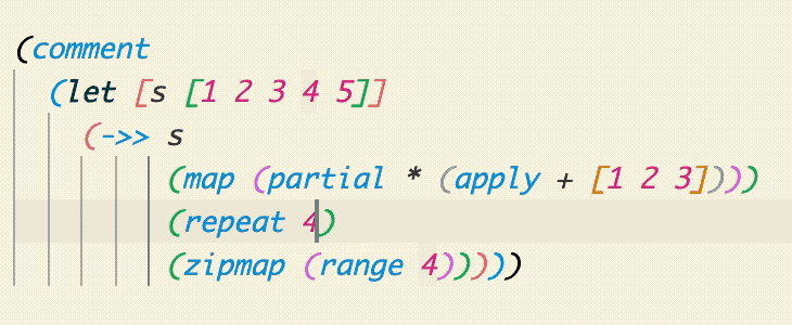 Select Top Level Form | Top level in a structural sense. Typically where your(def ...)/(defn ...) type forms. Please note that(comment ...) forms create a new top level. ![]() |
